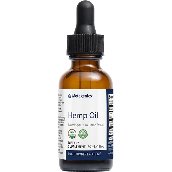 Metagenics Hemp Oil is an organic, broad-spectrum hemp extract sourced from aerial plant parts (stalk, stems, seeds, and flower) that consists of naturally occurring phytocannabinoids and terpenes, which have been shown to support body function and general health,*