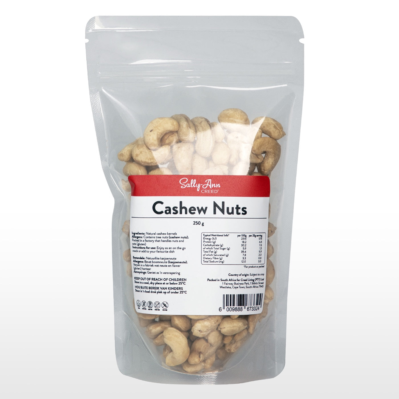 The cashew tree is a tropical evergreen tree that produces seeds within a cashew ‘apples’, The seed is what is commonly known as a snack item, the cashew nut, Cashew nuts are known to be lower in fat content than most nuts and roughly 75% of their unsaturated fat content is from oleic acid, which is the same heart-healthy monounsaturated fat found in olive oil, Studies have shown that oleic acid is good for promoting cardiovascular health, In addition to this, cashews are a good source of copper, magnesium, zinc and biotin, Sally-Ann Creed® Cashew Nuts are derived from cashew nut kernels, which are peeled, roasted and shelled, They are a delicious on the go snack packed with goodness, just as nature intended,